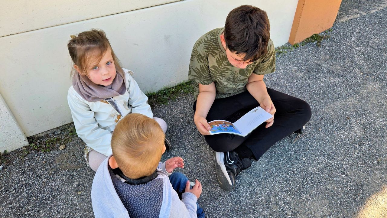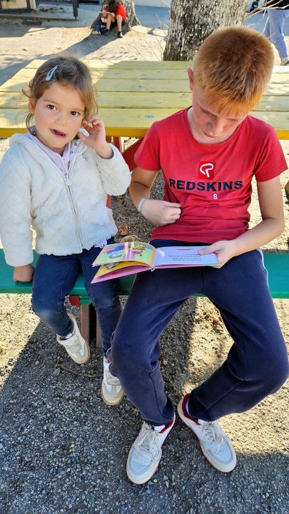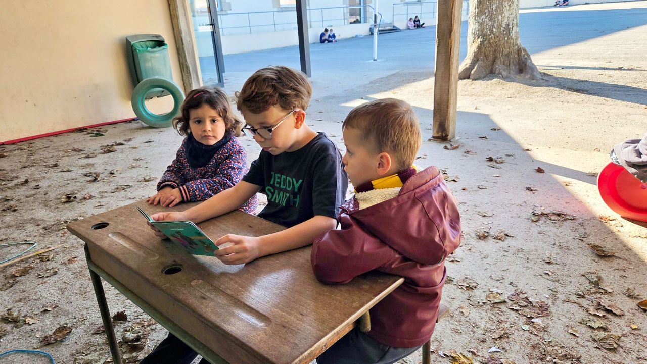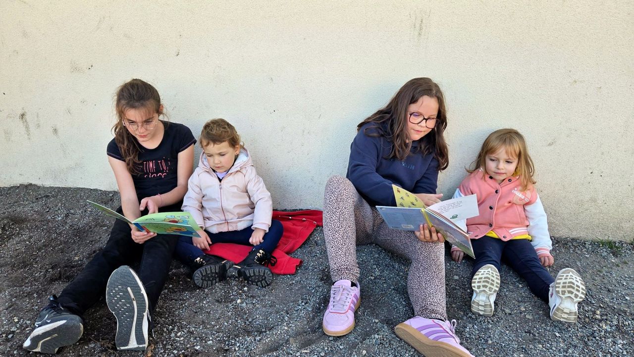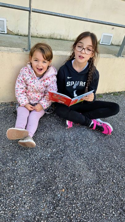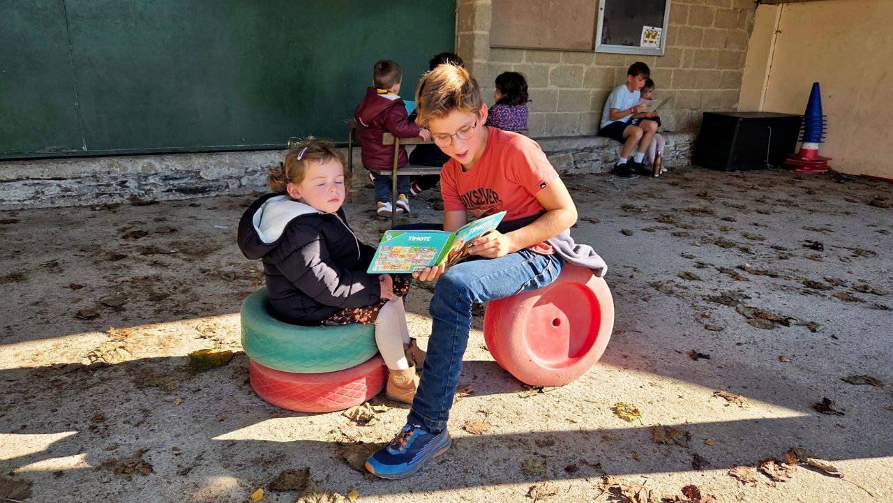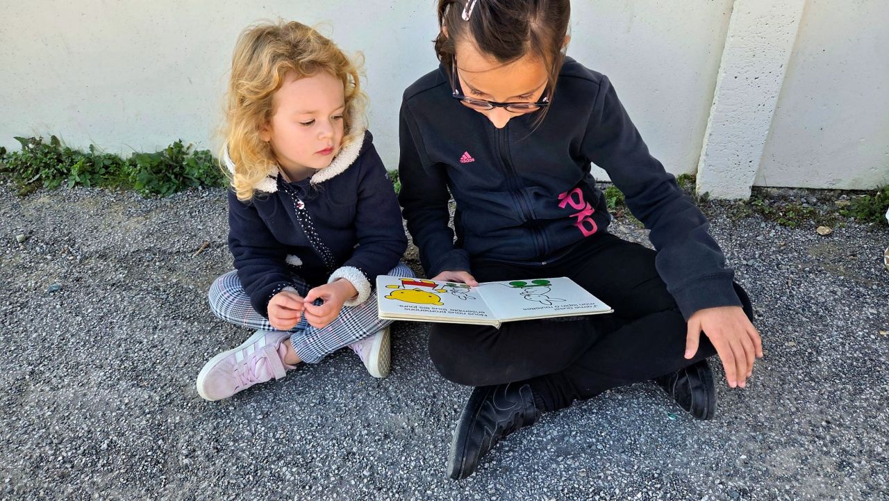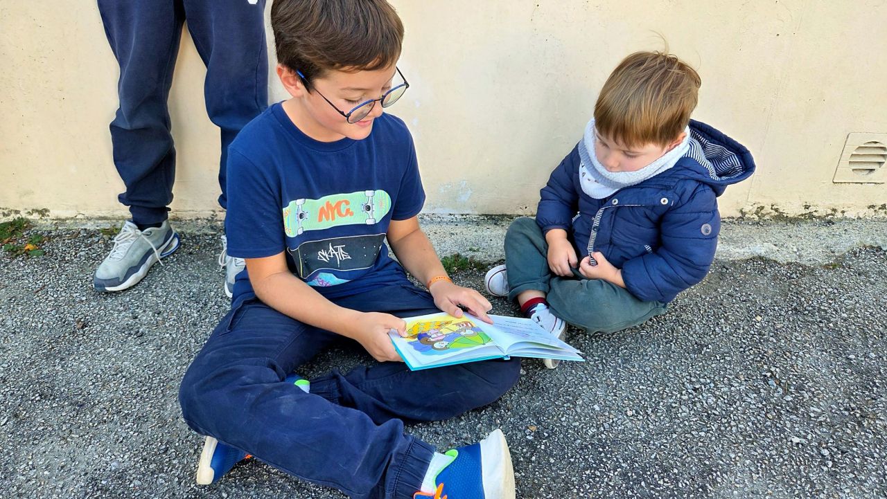 Le vendredi 17 octobre, les élèves de CM2 et de Petite Section se sont retrouvés sur la cour de récréation pour partager un temps de lecture d'histoires sous le soleil.